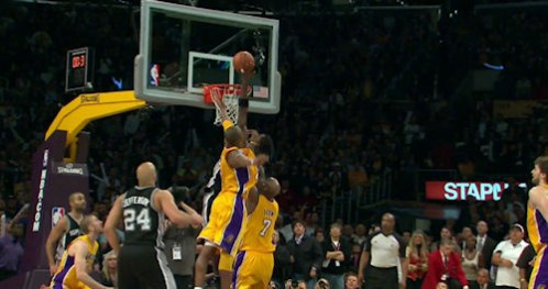 D’abord, il faut revenir à l’action précédente. Les Lakers viennent de prendre l’avantage sur deux lancers de Pau Gasol. Les Spurs ont quasiment dominé tout le match mais on les sent à court de munitions. Ils n’ont plus marqué un point depuis deux minutes ! Tony Parker est exceptionnel (9 sur 9 aux tirs d’affilée !), il compense le non match de Manu Ginobili.