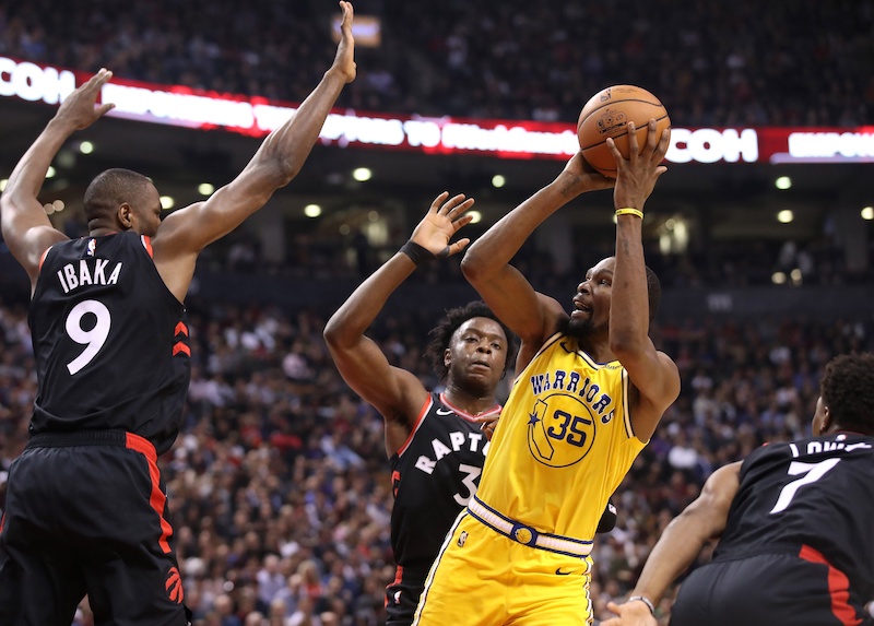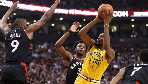 L’ailier All-Star est bouillant et inscrit deux paniers primés dans les ultimes secondes pour envoyer les deux équipes en prolongation. Il enchaîne dans la foulée en marquant quatre points, mais avec ses 51 points, il est trop seul. Klay Thompson ne rentre plus rien depuis le début de dernier quart-temps et les Californiens perdent trop de ballons. Ce sont des trop gros cadeaux pour Kawhi Leonard et Pascal Siakam, et les Raptors s’imposent après une superbe partie.