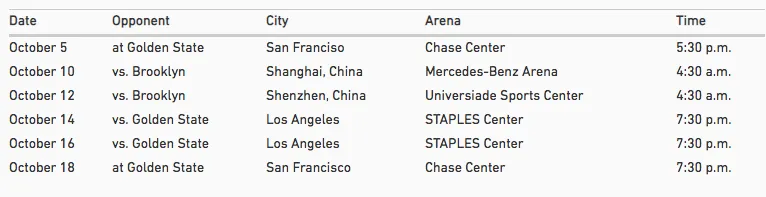 Les Lakers viennent effectivement d'annoncer sur leur site officiel l'intégralité de leur calendrier de présaison. Outre leur périple chinois, ils affronteront donc les Warriors à quatre reprises (façon playoffs) avec deux matchs à San Francisco, et les deux autres au Staples Center de Los Angeles.