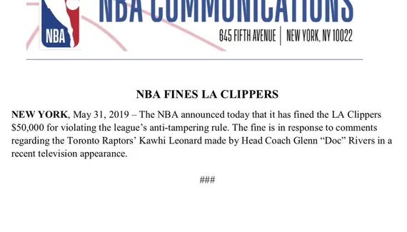 La Ligue vient effectivement d'infliger une amende de 50 000 dollars au coach des Clippers qui a déclaré que Kawhi Leonard, la cible n°1 des Clippers cette intersaison, était “le joueur qui se rapprochait le plus de Michael Jordan”.