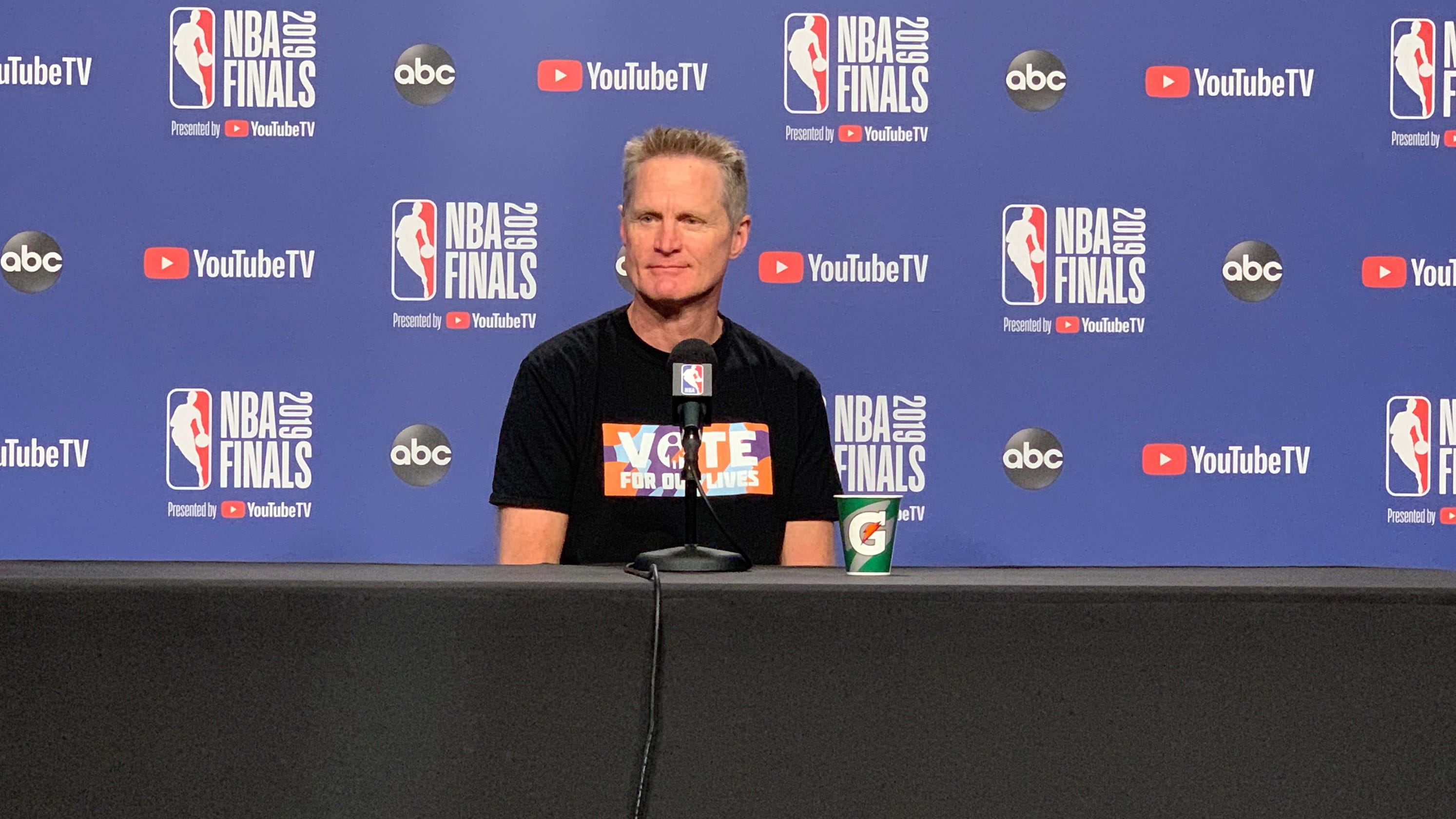 Le Game 2 entre Raptors et Warriors avait des relents très politiques. Outre la présence de Barack Obama, ovationné par la Scotiabank Arena, Steve Kerr s’est présenté en conférence de presse d’avant-match avec un t-shirt sur lequel était imprimé « Vote For Our Lives ». Un t-shirt éminemment politique sur lequel le coach des Warriors, qui n’était pas au courant de la venue de l’ancien président américain, a été interrogé.