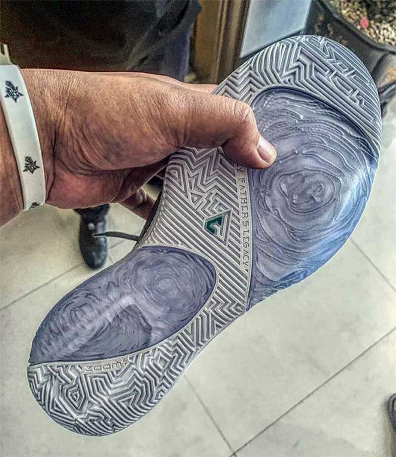 Mais ces nouvelles images permettent surtout d’avoir un meilleur aperçu du talon et de la semelle, dont le motif est inspiré par la rose. Il s’agirait d’un hommage à la Grèce et au père du joueur des Bucks. La famille, il est en d’ailleurs question aussi avec les inscriptions gravées au niveau du talon, où on aperçoit le nom de ses frères.