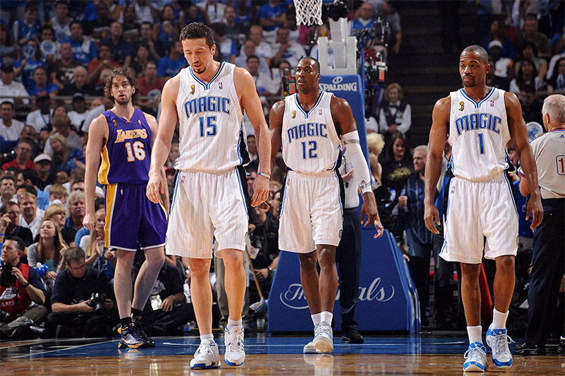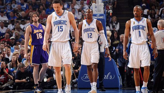 Après le départ d’Hedo Turkoglu, l’été suivant, Orlando a tenté de rebondir en prenant Vince Carter et Matt Barnes, en intronisant un autre poste 4 shooteur digne de ce nom (Ryan Anderson), l’associant à un autre ailier fort plus physique (Brandon Bass). La saison est une réussite (59v-23d pour la deuxième année de suite), mais le Magic bute cette fois en finale de conférence face à Boston, sans solution face aux problèmes de fautes de Dwight Howard et de discrétion chronique de Vince Carter.