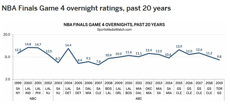 Cela faisait 55 matchs des Finals de suite avec une part de marché à deux chiffres. Le Game 4 2019 entre les Warriors et les Raptors vient de briser cette belle série. Difficile de faire plus parlant.