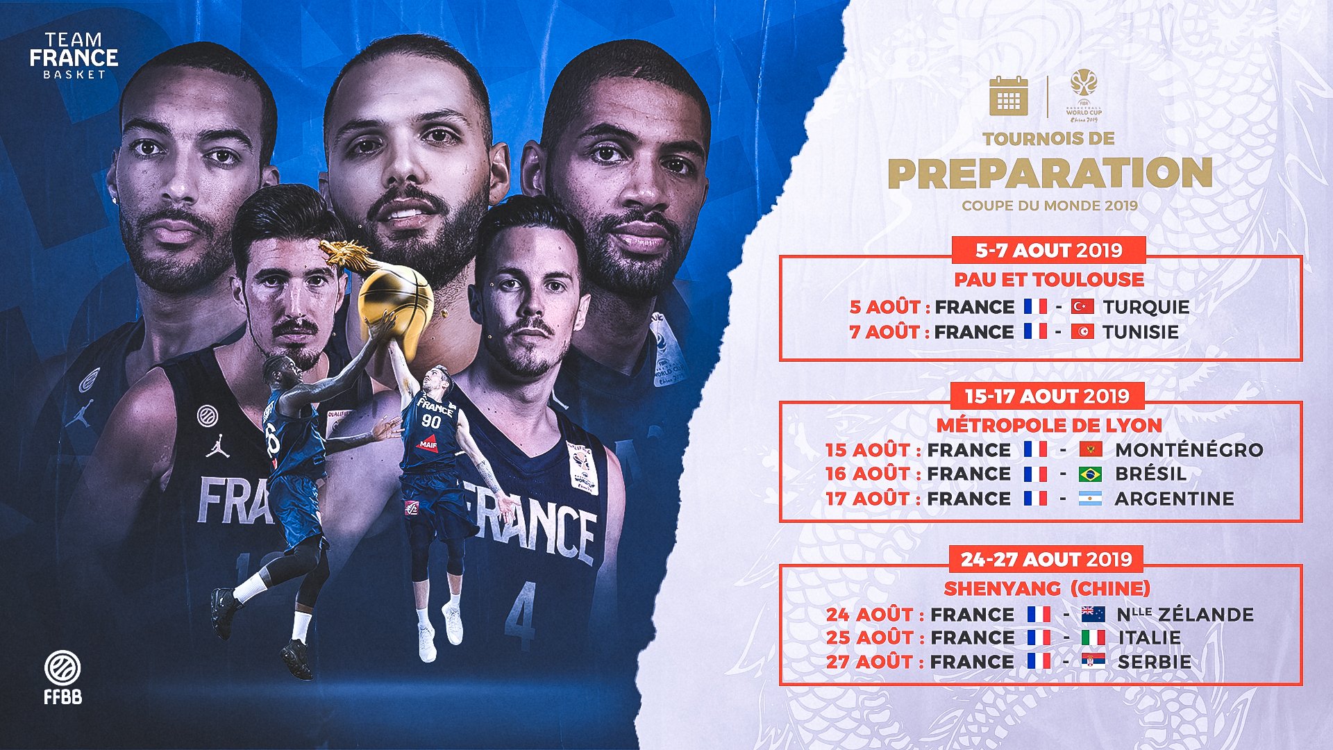 Afin de se préparer pour la Coupe du Monde, l’équipe de France a mis au point un programme court mais intense, avec cinq matchs de préparation en France (Pau, Toulouse et Lyon) et un tournoi en Chine avant la compétition.