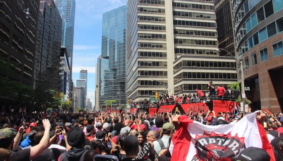Personne ne s’imagine que le cortège des Raptors ne sera ici que… quatre ou cinq heures plus tard. Avec beaucoup de retard. Devant le flux impressionnant et continu de la foule dans University Avenue, John, un journaliste reporter d’images de la CBC n’en revient pas : “Je crois n’avoir jamais vu autant de monde dans les rues de Toronto qu’aujourd’hui”. À chaque fois qu’il lève sa caméra, il peut mesurer l’enthousiasme collectif de la foule stimulée par l’objectif.
