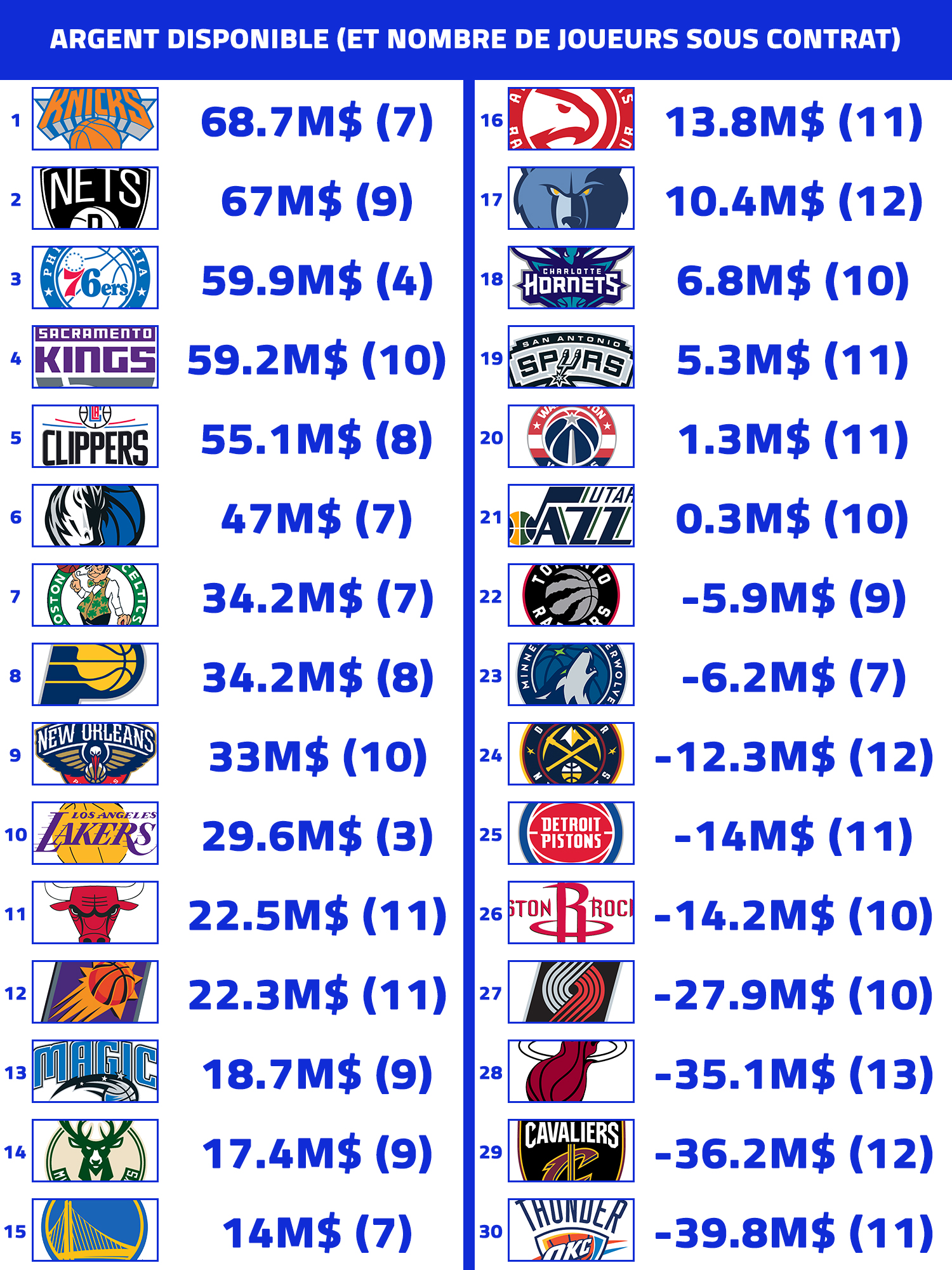 Les chiffres mentionnés ci-dessous ne prennent pas en compte les accords verbaux passés ces derniers jours. Ainsi, les Nets pointent à 67 millions mais si Kyrie Irving signe, il ne leur restera que 35 millions. Même chose avec son successeur à Boston, Kemba Walker, Klay Thompson à Golden State, ou Nikola Vucevic à Orlando. Les Bucks auraient quant à eux coupé George Hill, mais rien n’est officiel, et le million qu’ils vont lui verser n’apparaît pas.