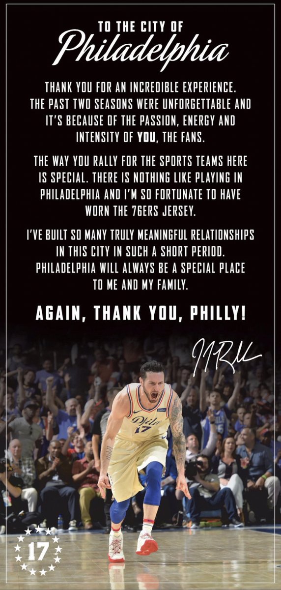 L’avenir de J.J. Redick à Philadelphie était plus qu’incertain avec les dossiers Jimmy Butler et Tobias Harris et, finalement, l’arrière a pris les devants en acceptant rapidement une offre des Pelicans. La fin d’une histoire courte mais intense avec les Sixers, à laquelle il a rendu hommage en se payant une pleine page dans le Philly Inquirer.