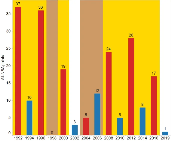 En instaurant un simple système de points : cinq points pour un membre de Team USA nommé dans la « All-NBA First Team » l'année de la compétition, trois points en « Second Team » et un point en « Third Team ». Voici le résultat avec des colonnes rouges pour les Jeux Olympiques et bleues la Coupe / Championnats du monde. En fond, la couleur de la médaille obtenue.