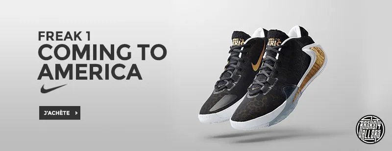 Commandez sur Basket4Ballers.com la Nike Zoom Freak 1 “Coming To America” hommage à l'un des films préférés de Giannis plus connu chez nous sous le nom de “un Prince à New-York”.