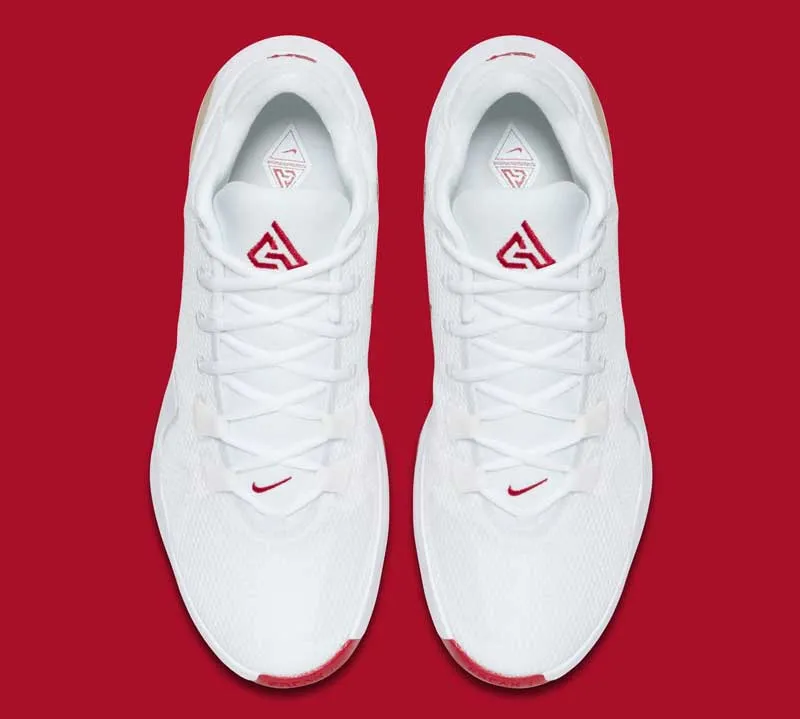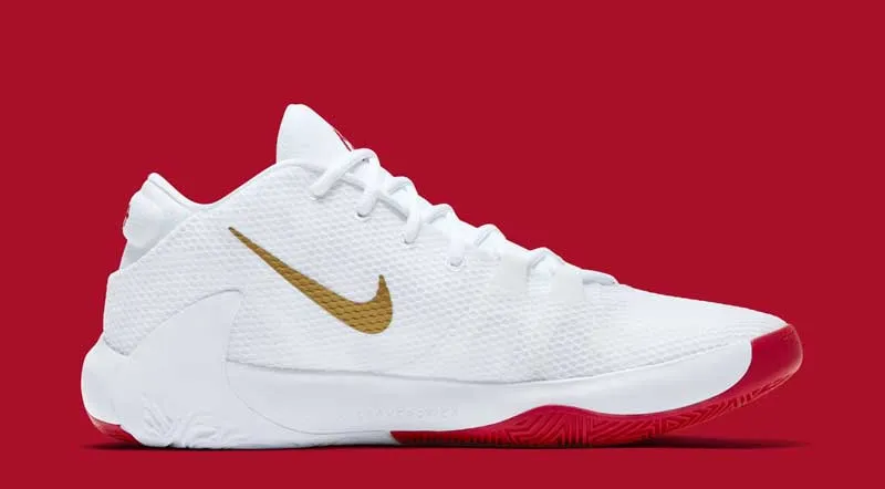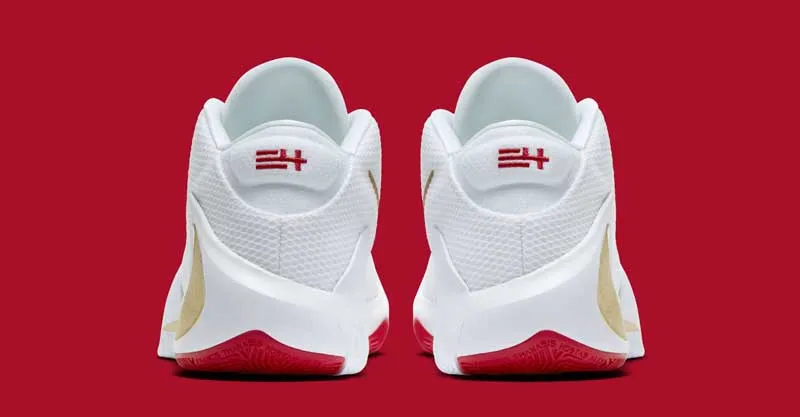 Rien de bien compliqué ici, puisque quelques touches de rouge et une virgule dorée viennent simplement se poser sur une chaussure blanche. Cette édition est présentée comme un hommage au père du MVP. Sur toutes les teintes de ce modèle, la semelle est d'ailleurs gravée avec l'inscription “I am my father's legacy” (Je suis l'héritage de mon père).
