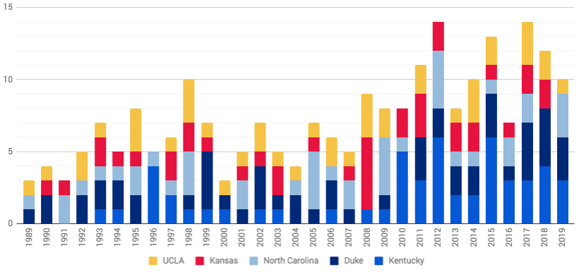 En rajoutant les trois autres universités qui fournissent le plus de joueurs à la Draft ces dernières années (North Carolina, Kansas et UCLA), on voit d’ailleurs que certaines cuvées sont composées à plus de 20% de basketteurs issus de ces programmes. Une tendance qui devrait s’atténuer avec la fin programmée du “one-and-done”.