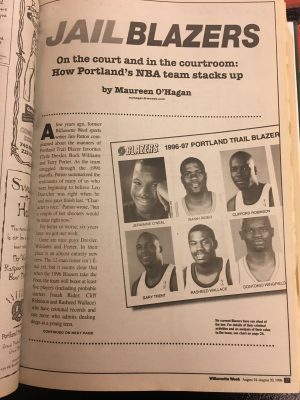| 14 août 1996 : Le surnom Jail Blazers apparaît pour la première fois noir sur blanc. C’est l’hebdomadaire Willamette Weekly qui publie un premier bilan de faits divers. |