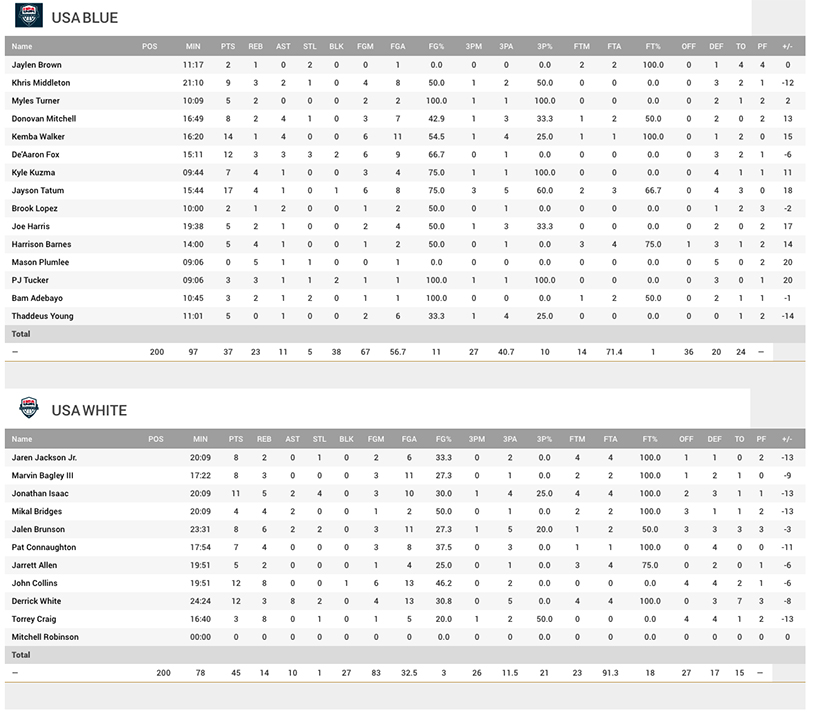 Le “training camp” de Team USA à Las Vegas s’est terminé par le traditionnel affrontement entre la “Blue Team”, qui correspond à la pré-sélection, et la “White Team”, composée de joueurs de la “Select Team”.