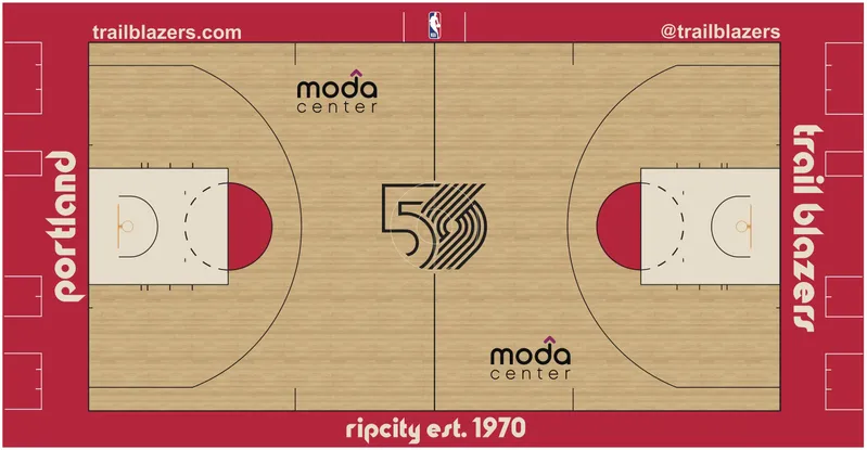 La touche nostalgique se retrouve dans le « 50 » au centre du parquet, avec le zéro qui prend la forme du logo de la franchise. Ce logo était présent au centre du parquet du Memorial Coliseum en 1970-1971, lors de la première saison des Blazers. On pourra lire aussi « Portland » et « Trail Blazers » sur les lignes de fond et le rouge prend une place plus importante que la saison passée. L'ancien parquet du Moda Center a été simplement poncé et peint, ce qui annonce sans doute un nouveau design pour la saison 2020-2021.