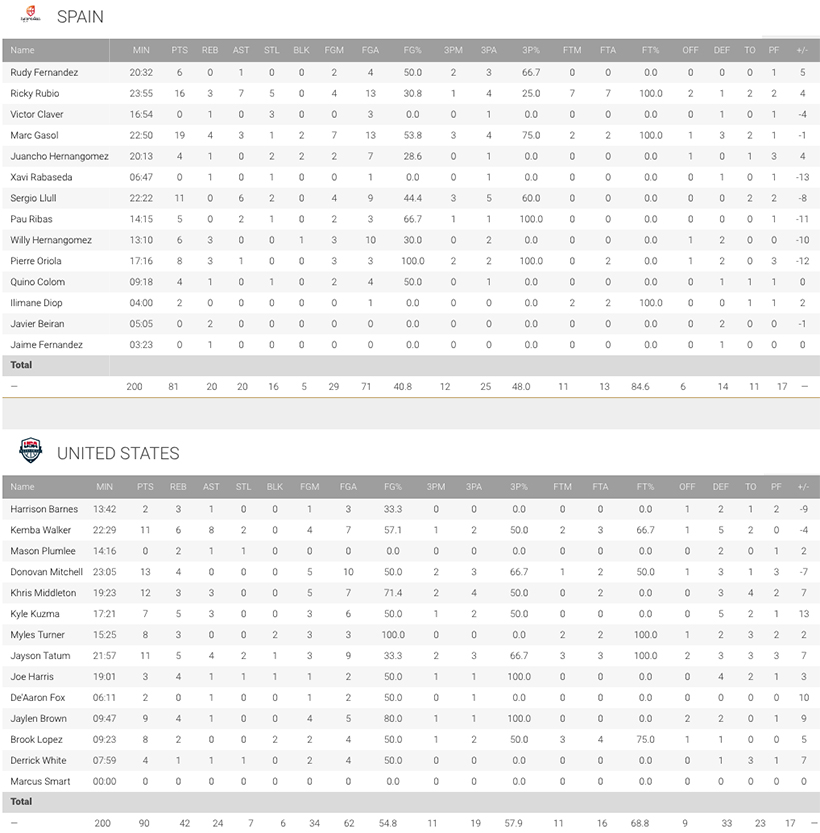 Malgré les paniers extérieurs de Sergio Llull et Rudy Fernandez, l’équipe américaine conservera quasiment tout le match ce matelas d’une dizaine de points d’avance. L’Espagne alterne avec des défenses de zone, mais Kemba Walker et ses camarades font bien circuler le ballon, alors que le duo Jayson Tatum – Jaylen Brown est hyper agressif. Et lorsque la Roja revient à 9 points (78-67) à cinq minutes de la fin, les Américains continuent de faire tourner le ballon, d’abord pour trouver Joe Harris à 3-points, puis Kyle Kuzma sous le cercle.