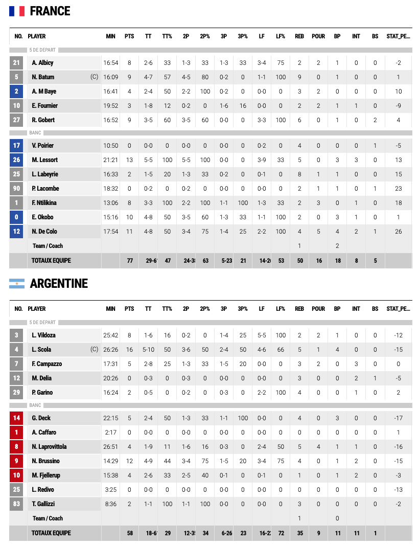 Il inscrit 8 points tout en proposant de belles séquences défensives. Même s’il a perdu quelques ballons par envie de bien faire, le staff français a sans doute apprécié son passage. La France remporte un troisième match en trois jours et, cette fois, elle a montré de bonnes choses pendant 40 minutes (77-58), même si les lacunes de l’Argentine en termes de taille et de profondeur de banc ont été particulièrement criantes.