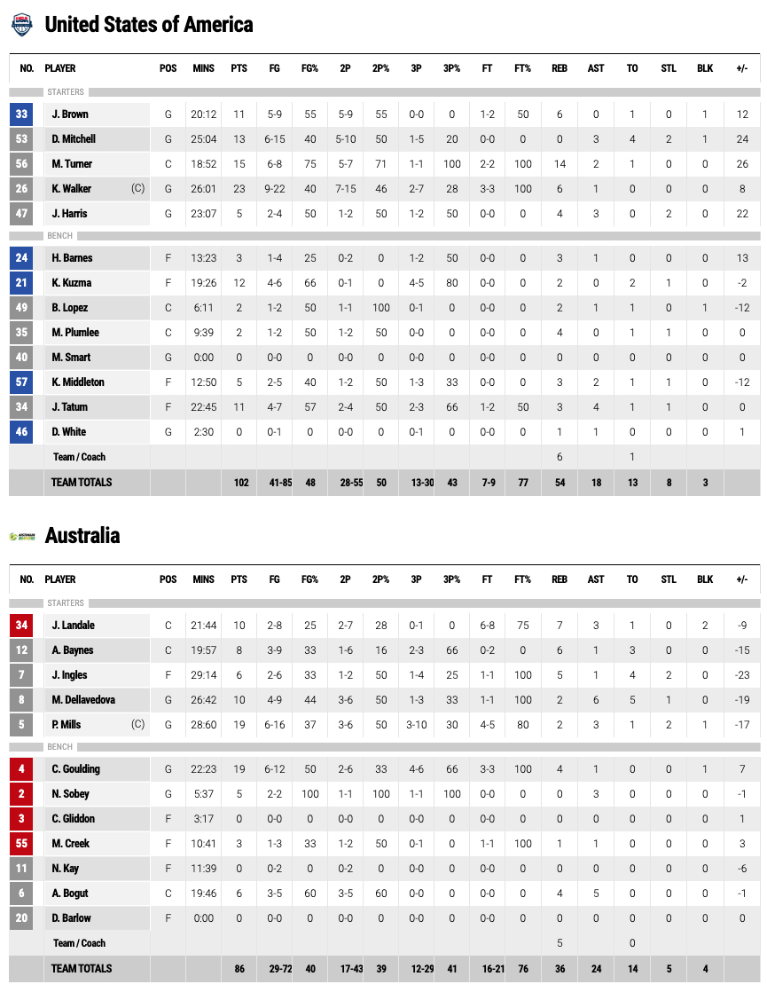 On le sentait venir, et sans surprise, les Australiens passent devant grâce à un “and-one” de Joe Ingles puis un dunk épatant d’Andrew Bogut (25-22). Sauf que ça pique au vif les Américains qui répondent par un 11-0 en deux minutes (33-25). L’agressivité de Kemba Walker et de Donovan Mitchell fait mal, et la polyvalence de Jaylen Brown pose des problèmes. Les Aussies stoppent l’hémorragie mais Jayson Tatum les assomme avec deux 3-points alors qu’ils défendaient dur (39-28). C’est le plus gros écart du match, et on pense que Team USA a fait le plus dur.