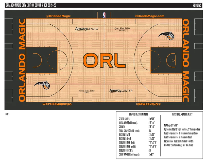Côté surprise, on note cet étonnant parquet orange pour le Orlando Magic, nommé en l'honneur du couple d'anciens propriétaires, Rich et Helen DeVos, décédés respectivement en 2018 et 2017.