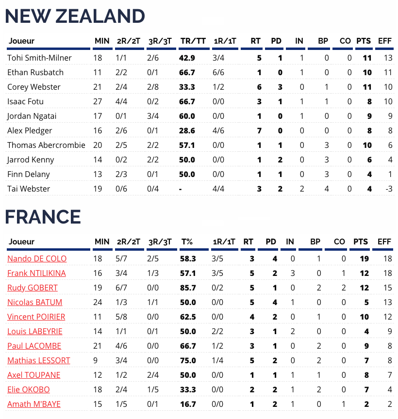 Vincent Poirier et Mathias Lessort font la paire à l’intérieur mais les deux joueurs se marchent dessus en attaque alors que défensivement, ils peine à stopper leurs adversaires. La France n’y arrive plus face au jeu atypique néo-zélandais avec des tirs à 3-points compliqués mais qui font mouche (8 à la pause !).