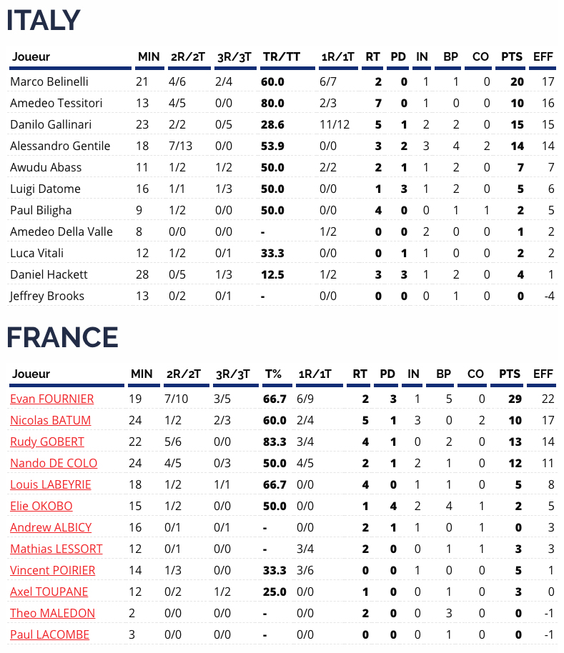 Grâce à un tir à longue distance, Evan Fournier bat son record de points en équipe de France. Avec 29 points au compteur, il aura été l’homme fort de son équipe. Les Italiens poussent les Bleus sur la ligne des lancers-francs afin de revenir dans le match, mais les Bleus ne craquent pas. Ils remportent ce match (82-80), le sixième de suite, mais leur marge reste fine.