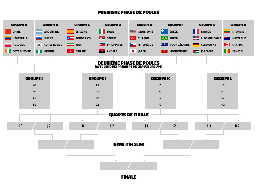 Pour la France, la compétition s’annonce ainsi rude. Sortir du groupe G (Allemagne, République dominicaine, Jordanie) ne devrait pas être trop compliqué, mais les Bleus devraient se retrouver ensuite lors de la deuxième phase dans le Groupe L, en compagnie des deux premiers du groupe H (Lituanie, Australie, Canada, Sénégal) et il faudra encore prendre l’une des deux premières places afin d’atteindre les quarts de finale. Et à ce stade de la compétition, les croisements du groupe L se font avec ceux du groupe K, là où se trouveront… Etats-Unis et Grèce !