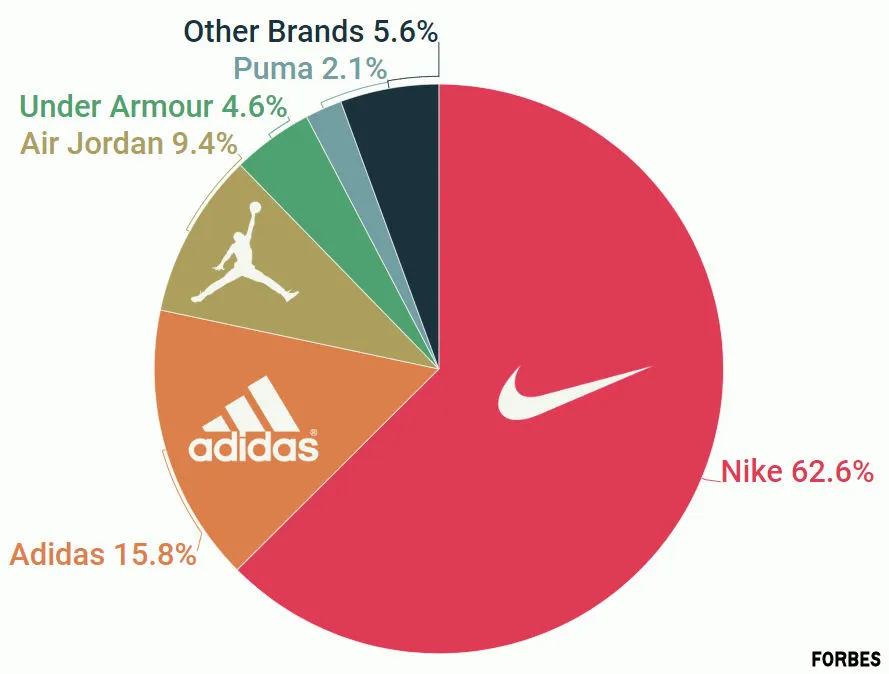 Les années se suivent et se ressemblent sur le marché des chaussures en NBA, et le magazine Forbes fait un état des lieux de ce secteur qui pèse des milliards de dollars. Ainsi, du côté des marques, Nike continue de planer sur le championnat puisque plus de 6 joueurs sur 10 portent des modèles de la marque à la virgule. Adidas est en 2e position avec près de 16% de parts de marché, suivi ensuite de Jordan Brand (9.4%) et Under Armour (4.6%).