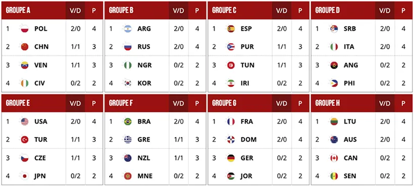 Après la Pologne, l’Argentine, la Russie, l’Espagne, la Serbie et l’Italie, c’est au tour de la France, de l’Australie ou encore de la Lituanie et de la République dominicaine de valider leur ticket pour le second tour. On ajoute les Etats-Unis, vainqueurs miraculeux de la Turquie, et le Brésil, vainqueur surprise de la Grèce. Soit 12 qualifiés sur 16 !