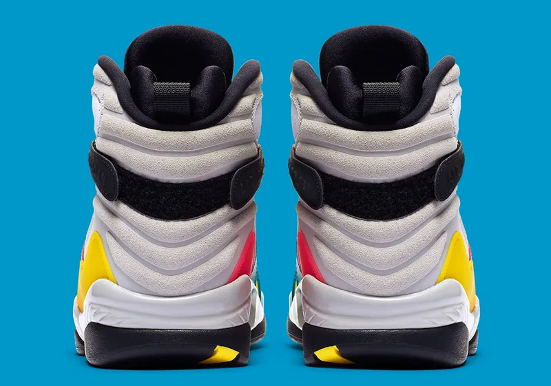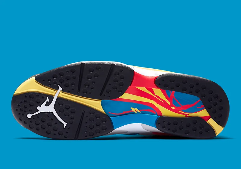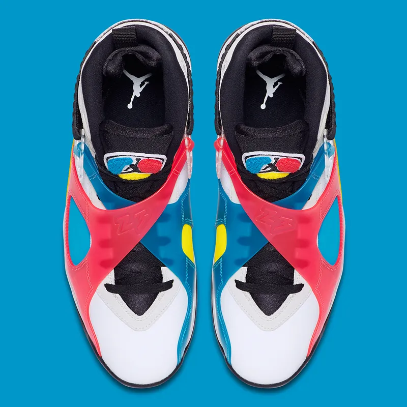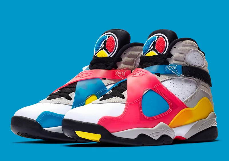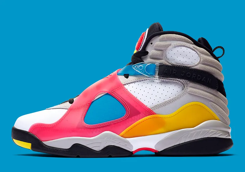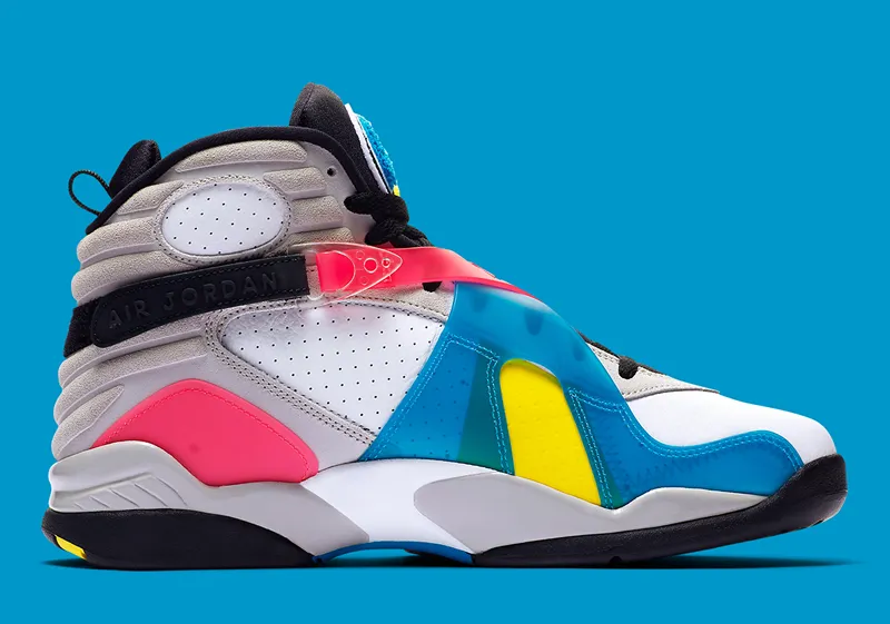 Michael Jordan a porté la Air Jordan 8 avant sa première retraite. Mais assurément pas dans la version SP qui sera mise en vente le 18 septembre. Cela se serait vu. Car les sangles qui se croisent sur le pied passent ici au plastique, avec des couleurs très vives. Le plastique des éléments qui relient les sangles est transparent.