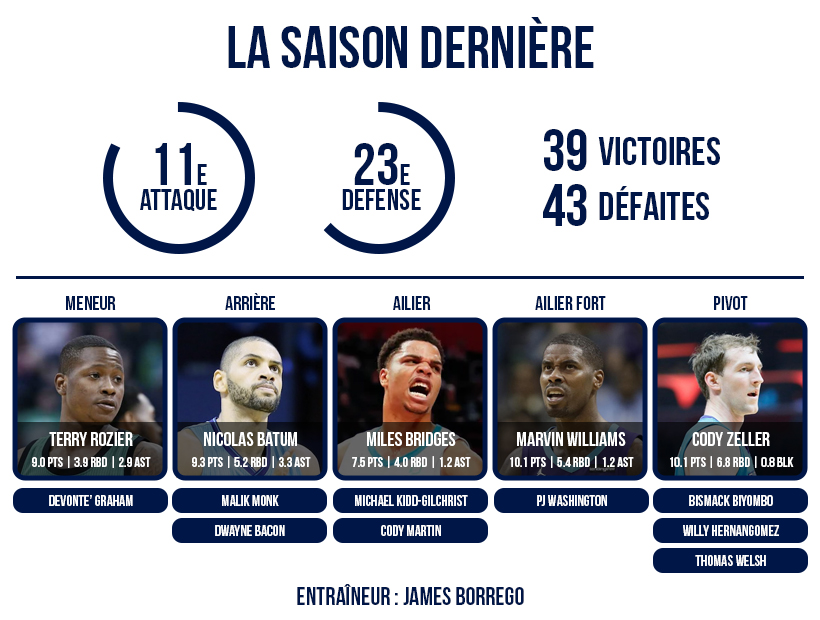 Départs : Kemba Walker (Celtics), Tony Parker (retraite), Jeremy Lamb (Pacers), Frank Kaminsky (Suns)