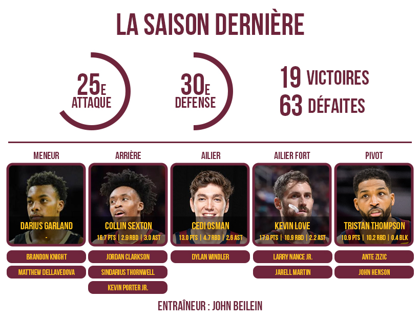 Sans surprise, Cleveland dispute à Charlotte le titre de plus mauvaise équipe de la ligue. Tristan Thompson est à nouveau à côté de son basket alors que Collin Sexton et Darius Garland se marchent sur les pieds. Quant à Kevin Love, il passe encore son temps à l’infirmerie et l’attaque de John Beilein se retrouve sans hiérarchie.