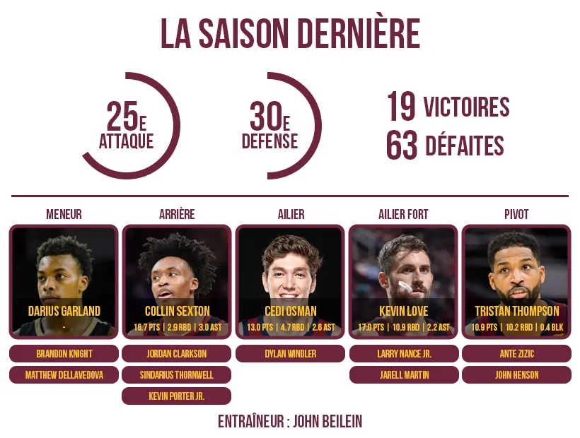 Sur le papier, il y a de quoi travailler, et la doublette Love-Thompson, par son expérience et son vécu, reste très correcte pour donner le change chaque soir. On verra d'ailleurs si Larry Nance Jr repousse Thompson sur le banc, avec un Love qui pourrait jouer 5, même si pourrait dépendre des matchups. À l'aile, c'est Cedi Osman qui devrait débuter, et ça donne un cinq un peu plus sexy que celui des Wizards ou des Hornets. Le problème, c'est que ça reste quand même très modeste, avec surtout d'énormes points d'interrogation en défense.