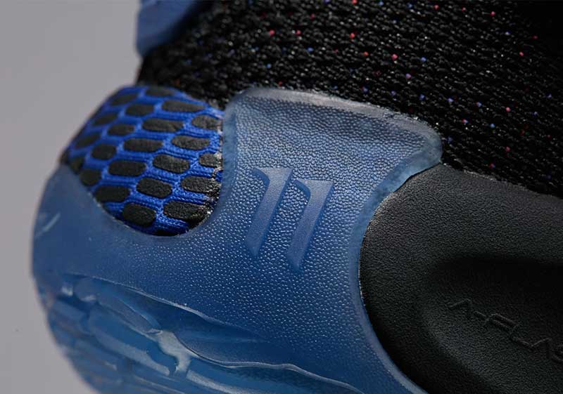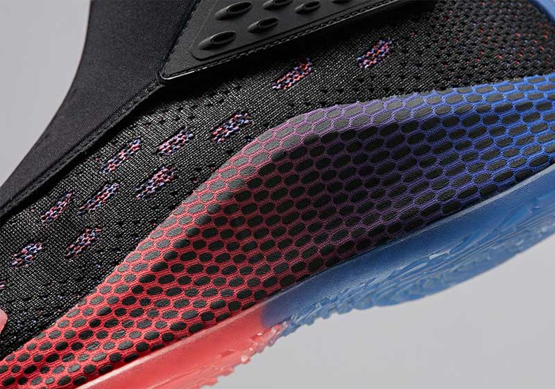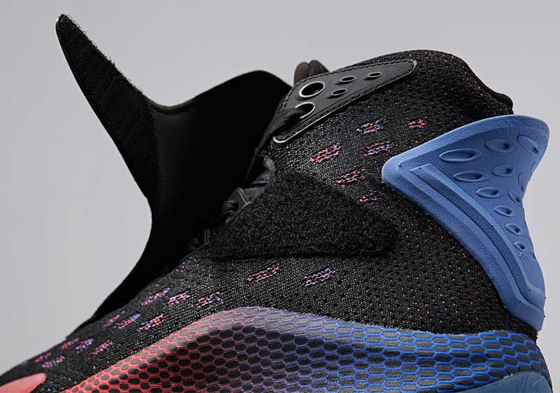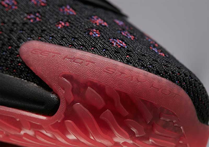 Une chaussure avec une tige en tissu, dont les lacets sont recouverts par un empiècement qui s’accroche par velcro. Sur la semelle, on retrouve le numéro 11, ou l’inscription “Get Hot Stay Hot.”