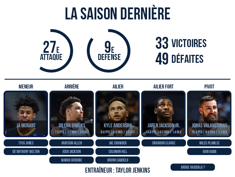 L’ensemble est beaucoup trop juste pour rivaliser avec les grosses écuries de l’Ouest. Trop jeunes, trop limités offensivement, les Grizzlies sont à leur place et jouent les derniers rôles de la conférence. Disciple de Mike Budenholzer, Taylor Jenkins tâtonne et ne parvient pas à imposer sa philosophie de jeu, qui se révèle brouillonne.