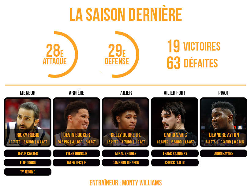 Pire équipe de l’Ouest depuis trois saisons, Phoenix est désormais habitué aux tréfonds de la ligue. Néanmoins, cette année, il y a un véritable espoir de voir des progrès. Quelques victoires de plus et un fond de jeu cohérent seraient déjà un bon début pour cette franchise qui se cherche depuis un bon moment désormais.