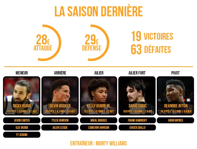 Pire équipe de l'Ouest depuis trois saisons, Phoenix est désormais habitué aux tréfonds de la ligue. Néanmoins, cette année, il y a un véritable espoir de voir des progrès. Quelques victoires de plus et un fond de jeu cohérent seraient déjà un bon début pour cette franchise qui se cherche depuis un bon moment désormais.