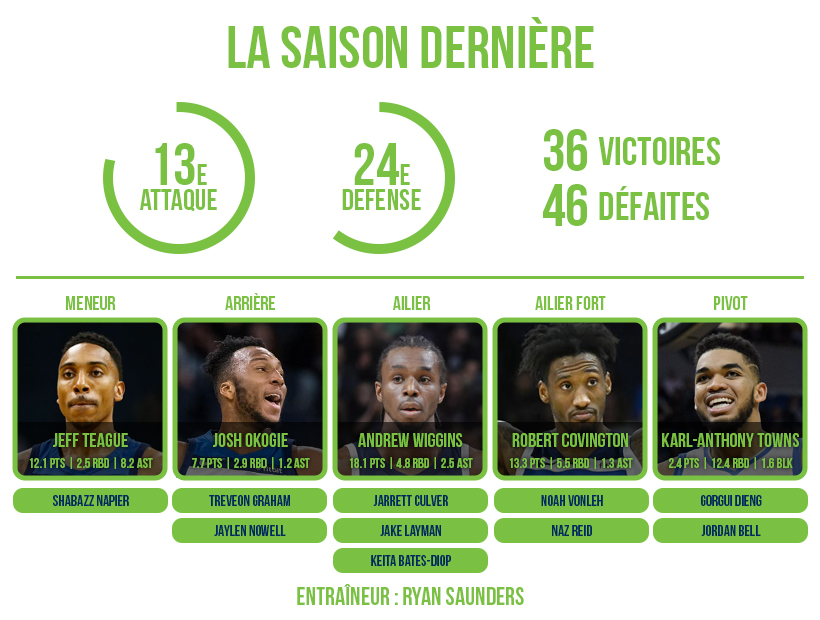 Avec l’arrivée du président Gersson Rosas et le maintien d’un jeune coach à la la tête de la troisième plus jeune équipe de la ligue, les Wolves espèrent écrire une nouvelle page de leur histoire qui les mènera enfin à nouveau en playoffs. Reste la question que se pose tous les fans de la franchise : combien de temps faudra-t-il encore attendre ?