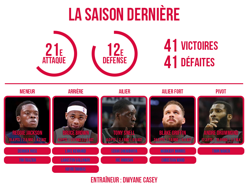 En recrutant notamment Tony Snell, Derrick Rose, Tim Frazier, Markieff Morris ou Christian Wood et récemment Joe Johnson, les dirigeants vont permettre à Dwane Casey de profiter d’un effectif plus profond. Une donnée déjà importante en soi, mais qui devrait surtout soulager les titulaires comme Blake Griffin ou Reggie Jackson pour les éloigner des soucis physiques.