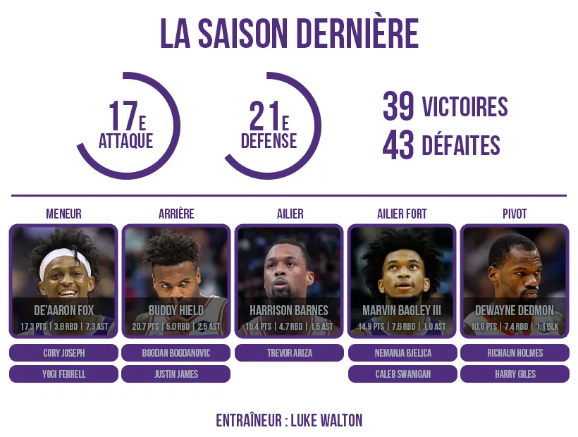 Après le transfert de DeMarcus Cousins en 2017, le Kings ont entamé une reconstruction qui s'est sérieusement accélérée l'an passé, avec un bilan proche des 50% (39 victoires et 43 défaites). Pas assez pour aller en playoffs, mais l'équipe fut l'une des bonnes surprises de la saison.
