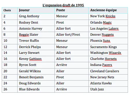 Ayant remporté le pile ou face avec Toronto, Vancouver a décidé de choisir plus haut lors de la Draft 1995, laissant en conséquence les Raptors choisir en premier lors de l’expansion draft qui concerne seulement les deux équipes canadiennes.