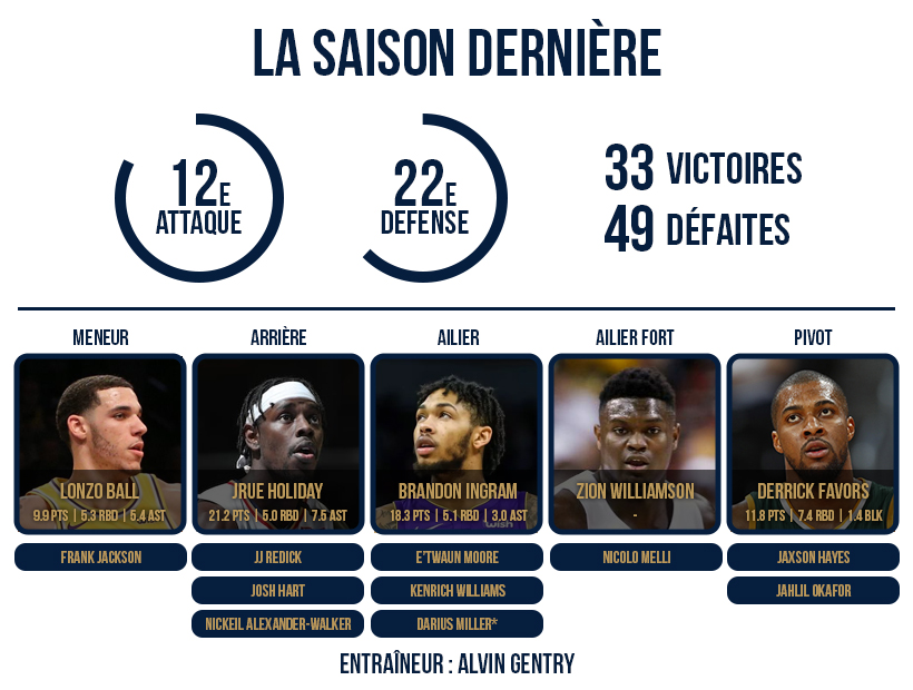 Le style prôné par Alvin Gentry offre des matchs spectaculaires, mais finalement peu de victoires. C’est globalement très brouillon, avec un équilibre délicat à trouver et un manque d’adresse général derrière la ligne à 3-points, d’autant que les Pelicans prennent beaucoup de risques en défense afin de jouer systématiquement la contre-attaque, et se font très souvent punir. Le changement d’air n’a pas non plus l’effet escompté sur Lonzo Ball et Brandon Ingram, toujours aussi inconstants, et cet effectif très jeune dit rapidement adieu aux playoffs.