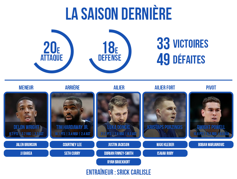 Aujourd’hui, place aux Mavs qui espèrent rebondir rapidement avec la prometteuse paire Doncic-Porzingis bâtie par Mark Cuban. Le propriétaire de la franchise texane a vu dans le jeune duo européen les deux plus dignes successeurs de Steve Nash et Dirk Nowitzki, tout juste retraité. Ce sera à Rick Carlisle de tirer le meilleur de son groupe dans la jungle de la conférence Ouest pour remplir l’objectif : retrouver les playoffs après trois ans de disette.