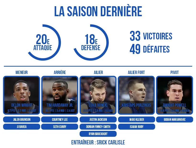 Il faut dire que les dernières saisons des Mavs n'ont pas vraiment été encourageantes, avec quatre éliminations au premier tour depuis 2012 et trois derniers exercices bouclés bien loin du Top 8. Luka Doncic a ravivé la flamme à lui tout seul la saison passée mais Dallas a tout de même fini à une triste 14e place à l'Ouest (33v-49d). De cette saison, il ne restera que l'éclosion du phénomène venu du Real Madrid qui a multiplié les exploits personnels et a raflé au passage le trophée du rookie de l'année (21.2 points, 7.8 rebonds et 6 passes décisives en moyenne par match).