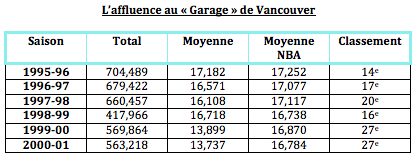 Une autre stipulation problématique était que Vancouver (et Toronto) devait prouver qu’ils avaient déjà sécurisé un paiement à 50% pour 12 5000 billets d’entrée avant le 1er janvier 1995. Une tâche quasi impossible quand on sait que Minnesota ou Orlando avaient éprouvé les pires difficultés à atteindre 10 000 abonnements avant leurs débuts officiels à l’automne 1989. Alors comment voulez-vous que les Grizzlies et les Raptors, dans un pays bercé par le hockey, puissent accomplir une telle mission ? D’autant que les Canucks n’arrivaient même pas à ses 12 500 billets en moyenne !