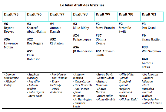 Sur les six années de draft de Vancouver, sans compter 2001 qui concernait Memphis, Vancouver a obtenu 5 sélections dans le Top 5 et une autre en 6e position. Si Bryant Reeves peut soulever quelques interrogations, l’idée de bâtir une nouvelle franchise avec un pivot dominant n’est pas une mauvaise idée dans les années 1990. Surtout que le choix n’était pas pléthorique derrière, seuls Damon Stoudamire ou un slasher (mais alors méconnu) comme Michael Finley auraient pu faire des différences et apporter un peu de spectacle. Pas trop de regret en 1995.