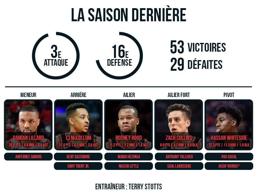 Finaliste de conférence contre toute attente la saison passée, Portland aurait pu jouer la stabilité avec un effectif riche et talentueux. Mais les Blazers ont décidé de continuer à modifier leurs rotations avec pas moins de sept nouvelles têtes à la rentrée, dont Hassan Whiteside et Kent Bazemore, deux vétérans amenés à jouer beaucoup de minutes cette saison. Neil Olshey, le GM en place depuis 2012, n’aime pas rester les deux pieds dans le même sabot et il tente de nouveaux paris avec Mario Hezonja ou encore Anthony Tolliver et Pau Gasol.