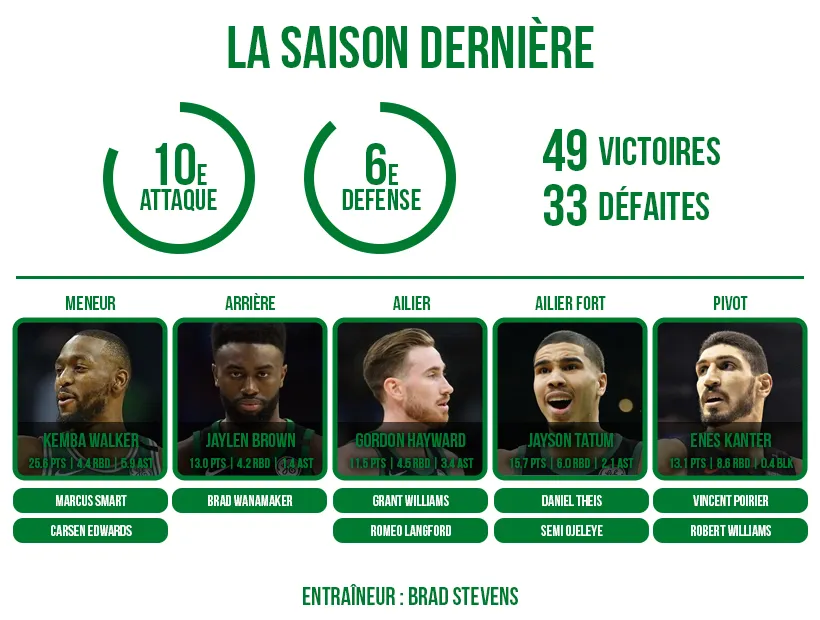 Aujourd'hui, place aux Celtics qui restent sur une saison décevante et qui ont perdu gros cet été : Kyrie Irving et Al Horford, partis chez des concurrents directs ! Ça aurait pu être très compliqué de se relever mais Boston a limité les dégâts et devrait encore animer la conférence Est dans un rôle de trouble-fête qui lui convient mieux.
