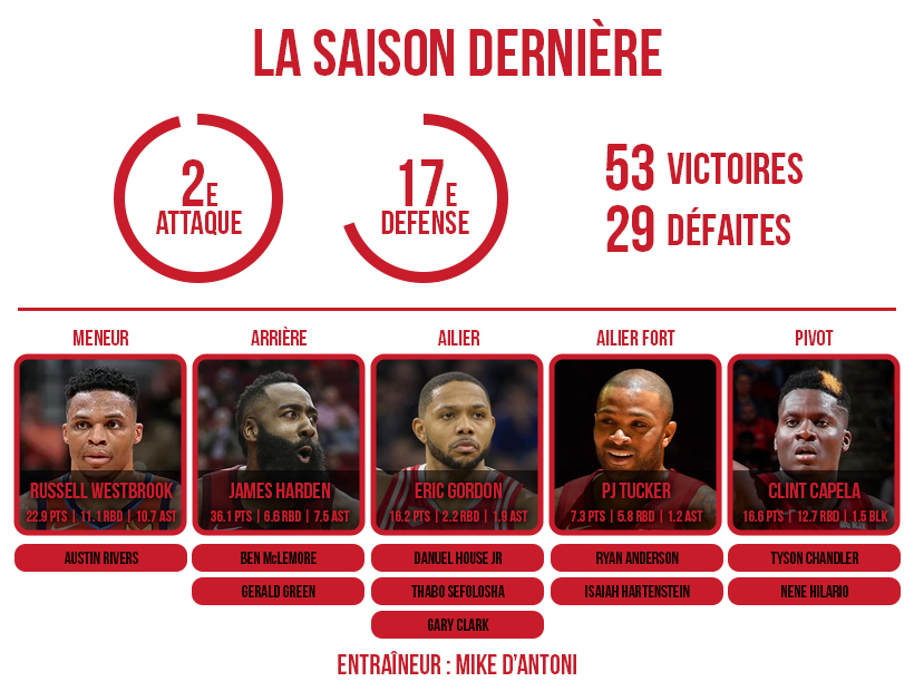 Il faudra apprendre à partager le ballon pour James Harden, et que les Rockets se servent de leurs snipers pour libérer de l’espace à Russell Westbrook, et vice versa. Mike D’Antoni devra trouver le bon schéma en sachant qu’autour des deux superstars, même Eric Gordon ne prétend pas à beaucoup plus que des 3-points. On notera tout de même que l’équipe s’est renforcée en défense avec deux spécialistes du genre : Tyson Chandler et Thabo Sefolosha. Avec P.J. Tucker, c’est du costaud pour l’adversaire si l’ancien Laker et l’ancien Jazz ne sont pas trop embêtés par les problèmes physiques.