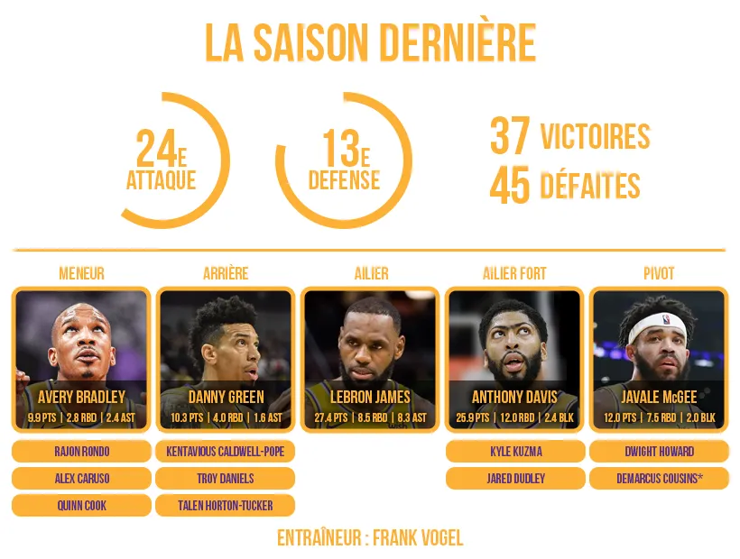 La franchise a donc reconstruit un effectif autour du transfert, enfin réalisé, d'Anthony Davis. Les jeunes sont partis, excepté Kyle Kuzma, et la troisième star (Kawhi Leonard notamment) s'est faite attendre, sans arriver. Ce sont donc des vétérans (deuxième équipe la plus âgée de la ligue cette saison) qui accompagneront les deux monstres : Rajon Rondo, JaVale McGee et Kentavious Caldwell-Pope ont rempilé quand Danny Green, Avery Bradley, Dwight Howard ou encore Jared Dudley et Quinn Cook seront de bons soldats.