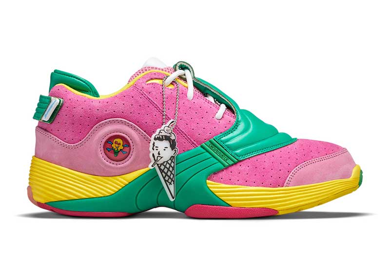 Sur la cinquième signature d’Allen Iverson, on retrouve le rose, le vert et le jaune du modèle Boardflip porté par Pharrell Williams en 2005. Officiellement, il s’agit d’une collaboration entre Reebok et Billionaire Boys Club, ce qui semble, d’une certaine manière, laisser Pharrell en-dehors de l’affaire, lui qui est sous contrat avec adidas. L’artiste est pourtant bien un des fondateurs de Billionaire Boys Club.